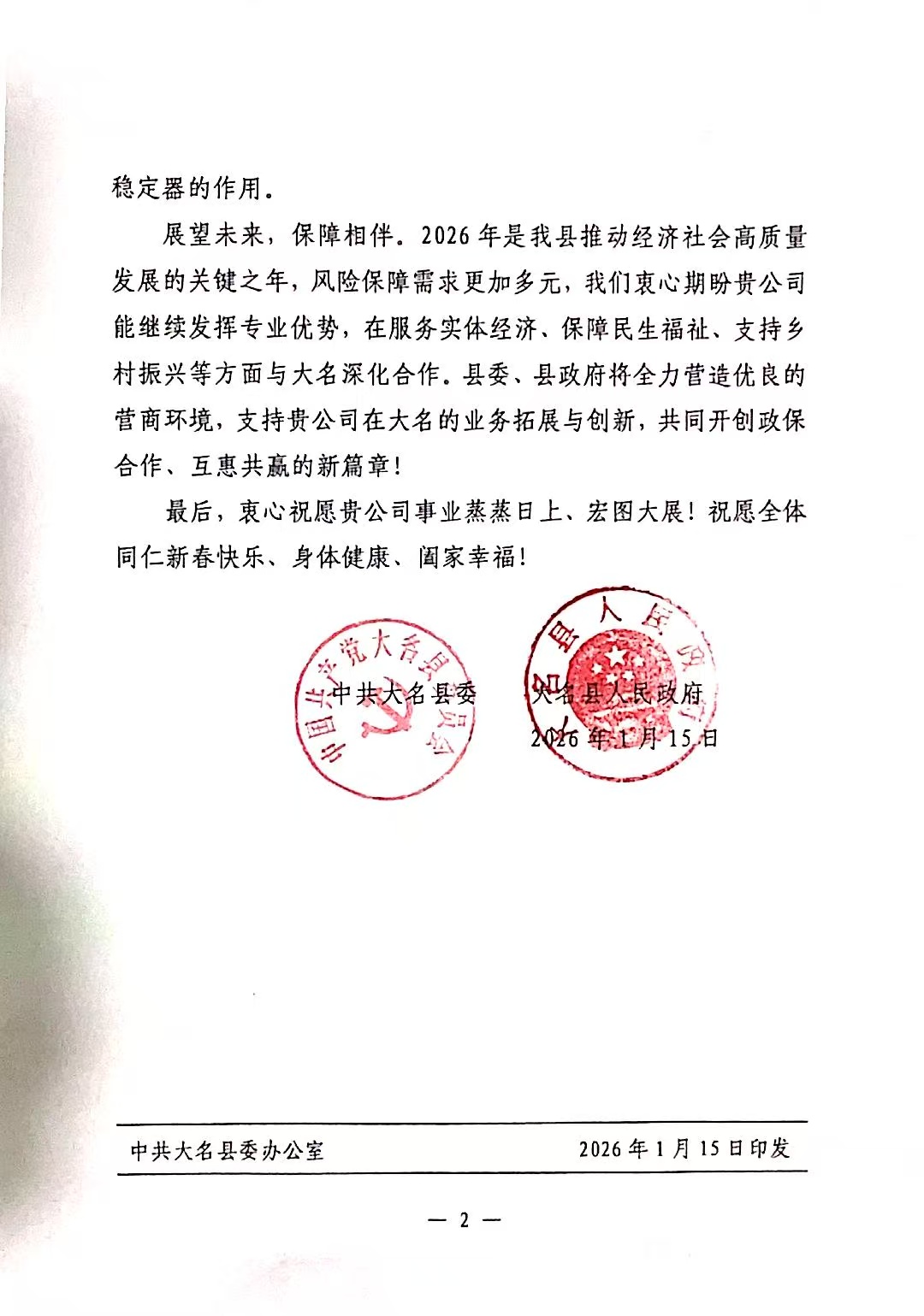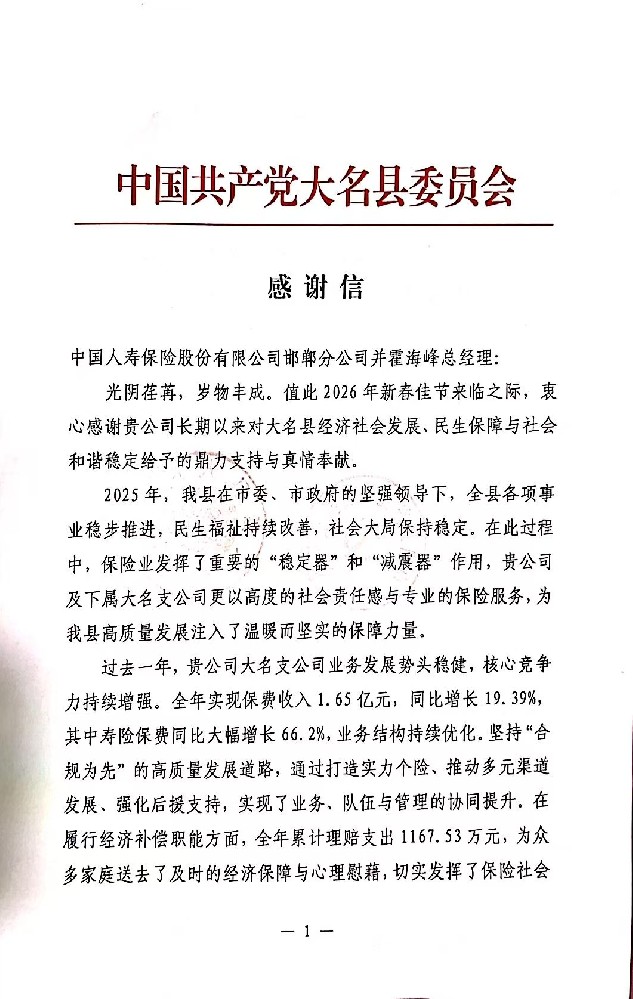 日前,中国人寿邯郸分公司收到大名县委、县政府感谢信,充分肯定保险工作。在过去的一年里,中国人寿邯郸分公司及大名支公司充分发挥保险稳定器和减震器作用,积极为大名县地方经济发展贡献力量。去年全年,累计为大名县贡献保费收入1.65亿元,同比增长近20%,累计为大名县域理赔支出1167.53万元,为众多家庭送去了及时的经济保障,有力地促进了大名县地方经济社会发展。